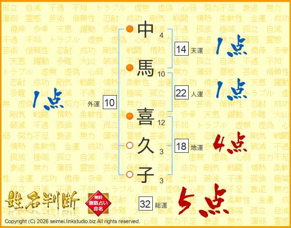 中(4画)馬(10画) 喜(12画)久(3画)子(3画)