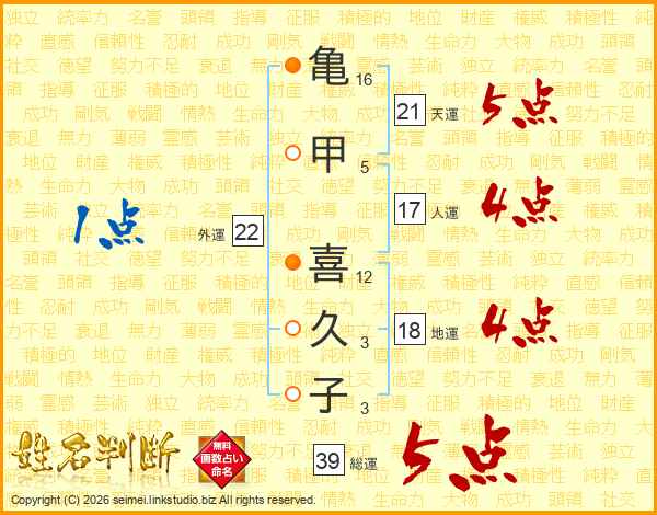 亀甲喜久子さんの総運は39画の5点!