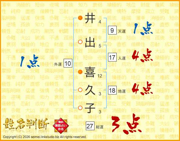 井(4画)出(5画) 喜(12画)久(3画)子(3画)