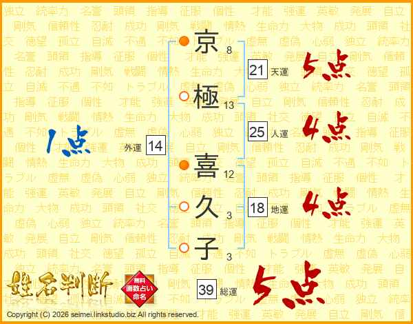 京(8画)極(13画) 喜(12画)久(3画)子(3画)
