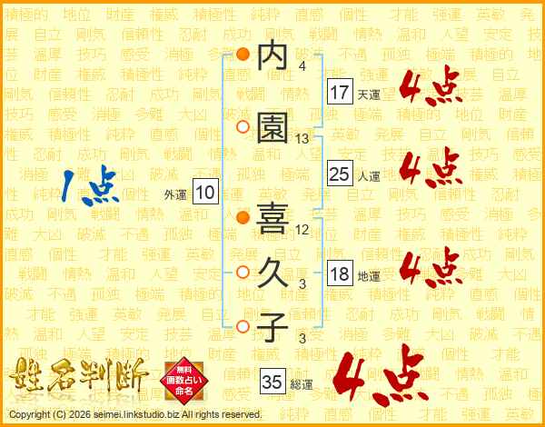 内(4画)園(13画) 喜(12画)久(3画)子(3画)