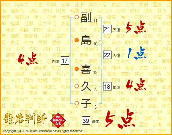 副(11画)島(10画) 喜(12画)久(3画)子(3画)