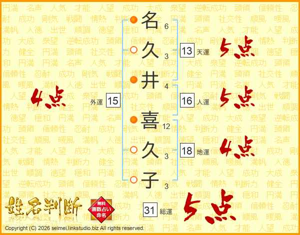 名久井喜久子さんの総運は31画の5点!