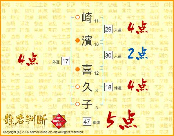 崎(11画)濱(18画) 喜(12画)久(3画)子(3画)