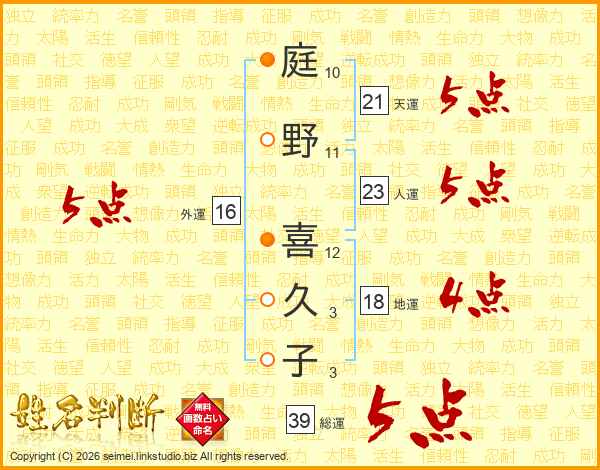 庭野喜久子さんの総運は39画の5点!