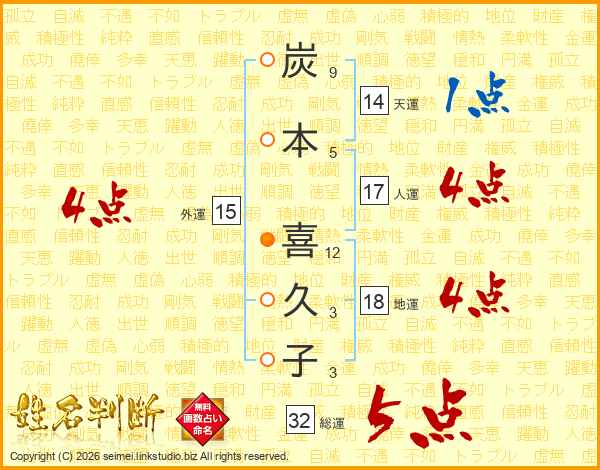 炭(9画)本(5画) 喜(12画)久(3画)子(3画)
