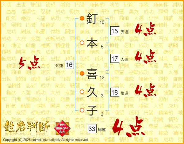 釘本喜久子さんの総運は33画の4点!