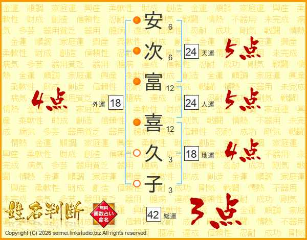 安(6画)次(6画)富(12画) 喜(12画)久(3画)子(3画)