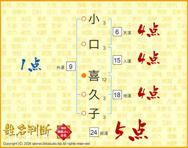 小(3画)口(3画) 喜(12画)久(3画)子(3画)