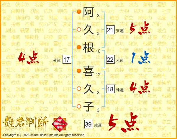 阿(8画)久(3画)根(10画) 喜(12画)久(3画)子(3画)