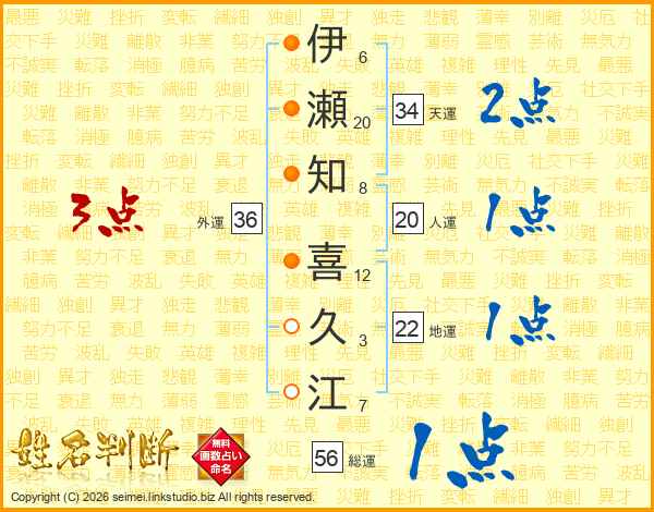 伊(6画)瀬(20画)知(8画) 喜(12画)久(3画)江(7画)