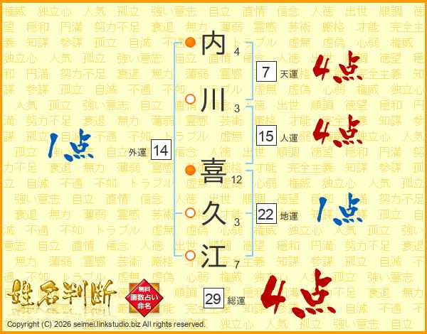 内(4画)川(3画) 喜(12画)久(3画)江(7画)
