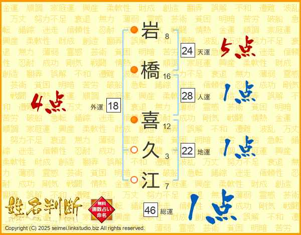 岩(8画)橋(16画) 喜(12画)久(3画)江(7画)