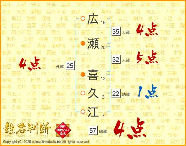 広(15画)瀬(20画) 喜(12画)久(3画)江(7画)