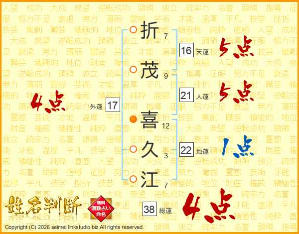 折(7画)茂(9画) 喜(12画)久(3画)江(7画)