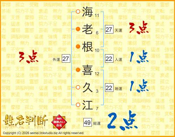 海(11画)老(6画)根(10画) 喜(12画)久(3画)江(7画)