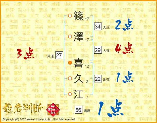 篠(17画)澤(17画) 喜(12画)久(3画)江(7画)