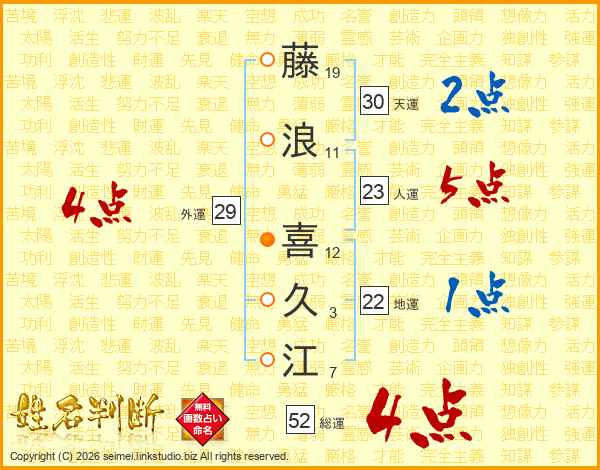 藤(19画)浪(11画) 喜(12画)久(3画)江(7画)