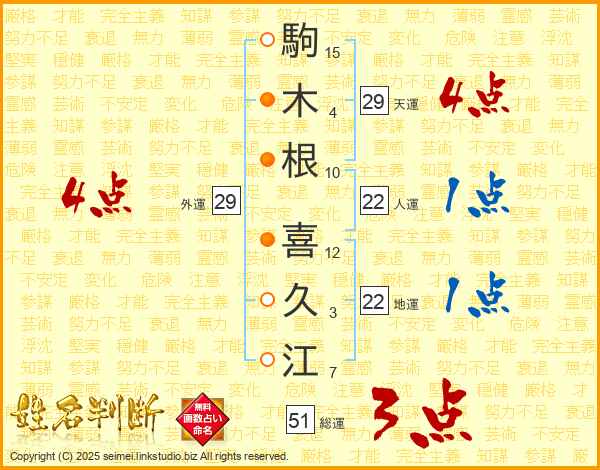 駒(15画)木(4画)根(10画) 喜(12画)久(3画)江(7画)