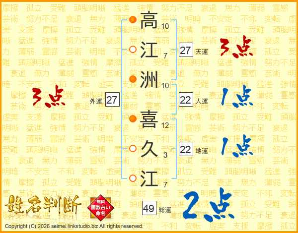 高(10画)江(7画)洲(10画) 喜(12画)久(3画)江(7画)