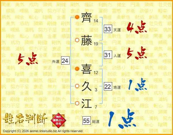 齊(14画)藤(19画) 喜(12画)久(3画)江(7画)