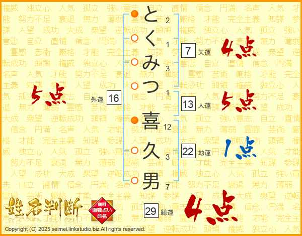 と(2画)く(1画)み(3画)つ(1画) 喜(12画)久(3画)男(7画)