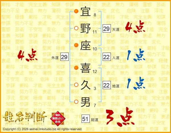宜(8画)野(11画)座(10画) 喜(12画)久(3画)男(7画)