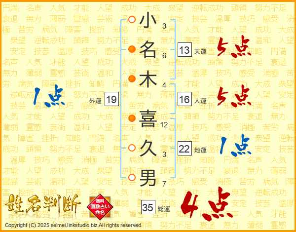 小(3画)名(6画)木(4画) 喜(12画)久(3画)男(7画)