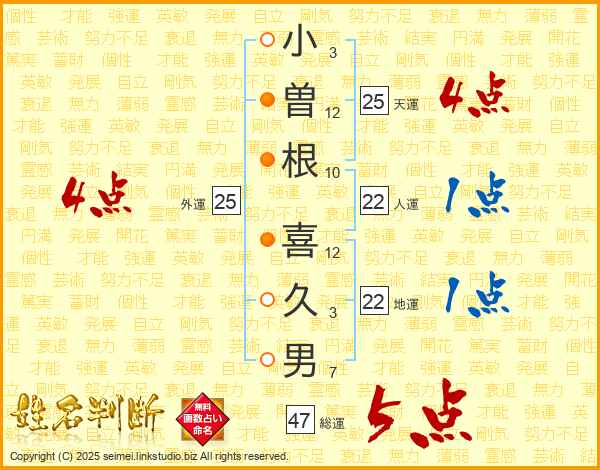 小(3画)曽(12画)根(10画) 喜(12画)久(3画)男(7画)