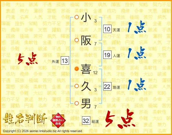 小(3画)阪(7画) 喜(12画)久(3画)男(7画)
