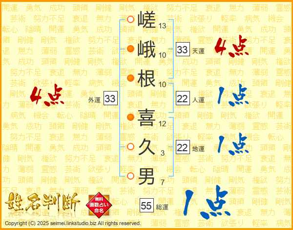 嵯(13画)峨(10画)根(10画) 喜(12画)久(3画)男(7画)