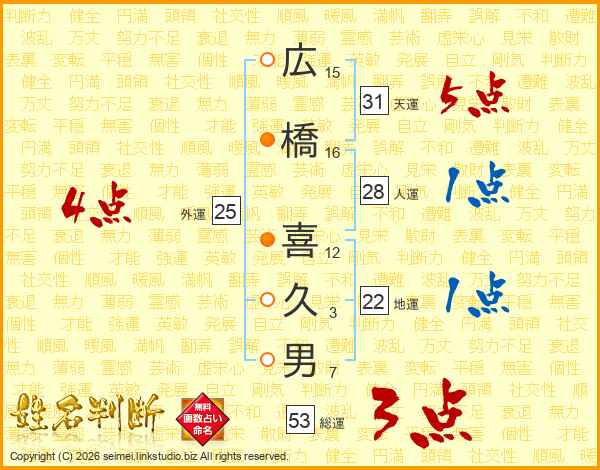 広(15画)橋(16画) 喜(12画)久(3画)男(7画)