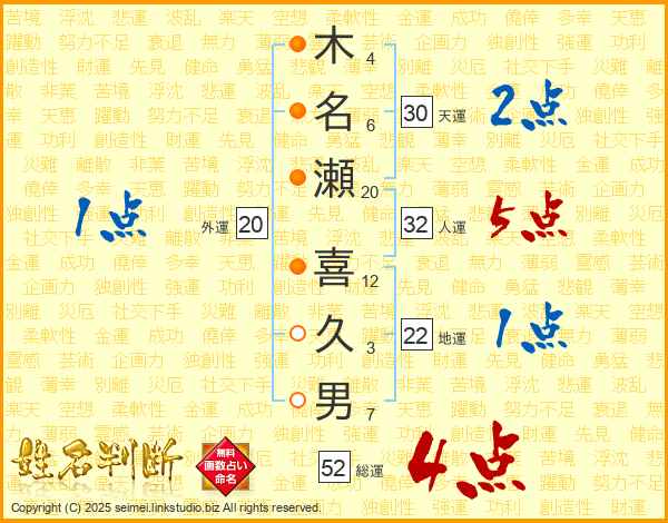 木(4画)名(6画)瀬(20画) 喜(12画)久(3画)男(7画)