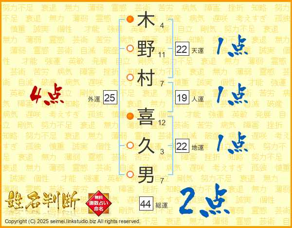 木(4画)野(11画)村(7画) 喜(12画)久(3画)男(7画)