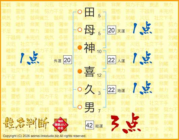 田(5画)母(5画)神(10画) 喜(12画)久(3画)男(7画)