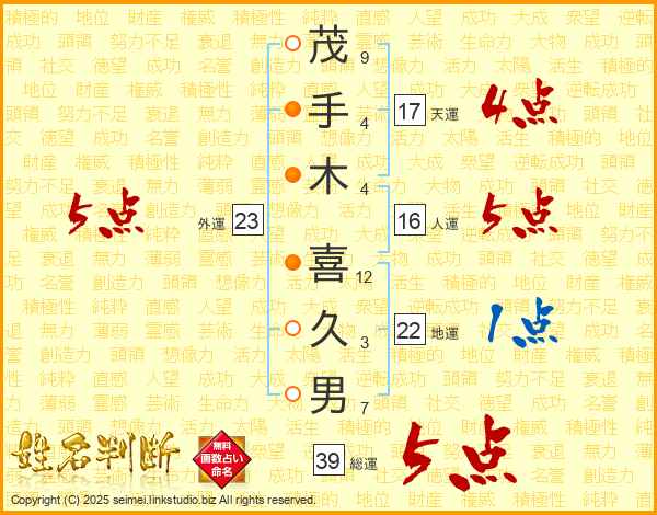 茂(9画)手(4画)木(4画) 喜(12画)久(3画)男(7画)