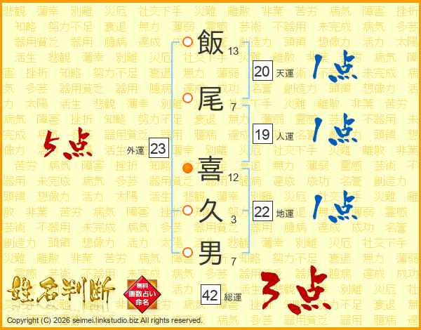 飯(13画)尾(7画) 喜(12画)久(3画)男(7画)