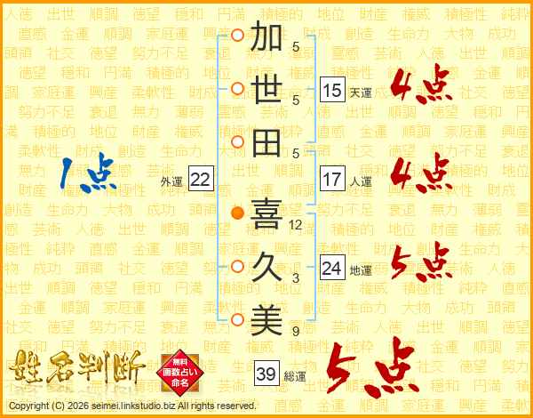 加世田喜久美さんの総運は39画の5点!