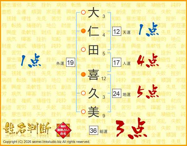 大(3画)仁(4画)田(5画) 喜(12画)久(3画)美(9画)
