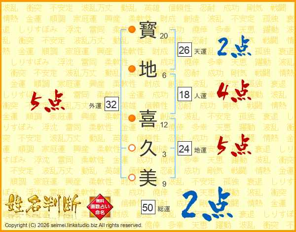 寳(20画)地(6画) 喜(12画)久(3画)美(9画)