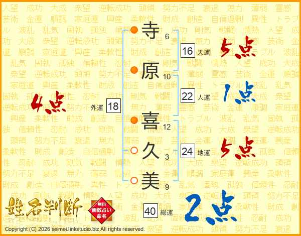 寺(6画)原(10画) 喜(12画)久(3画)美(9画)