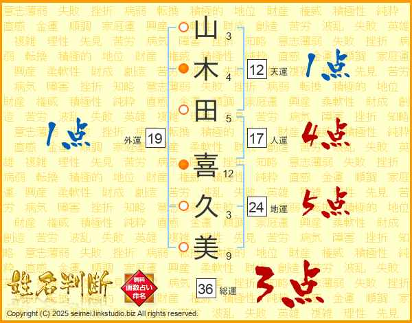 山(3画)木(4画)田(5画) 喜(12画)久(3画)美(9画)