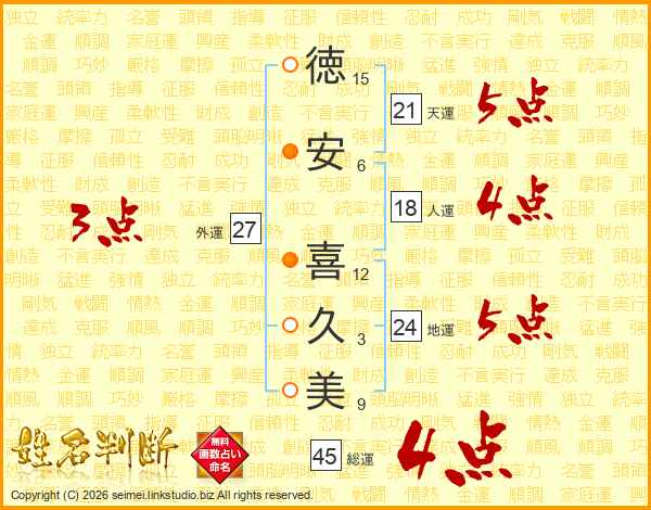 徳(15画)安(6画) 喜(12画)久(3画)美(9画)