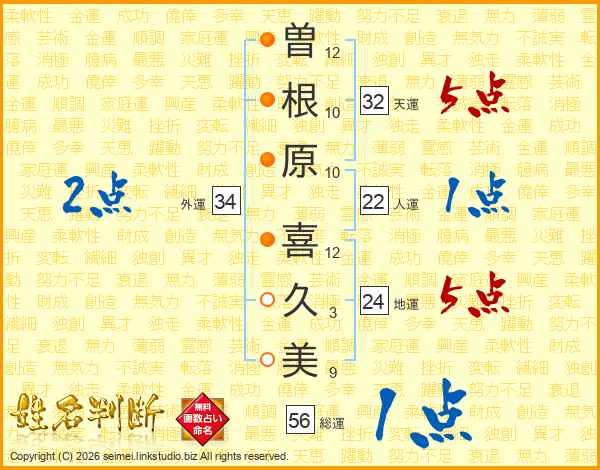 曽(12画)根(10画)原(10画) 喜(12画)久(3画)美(9画)