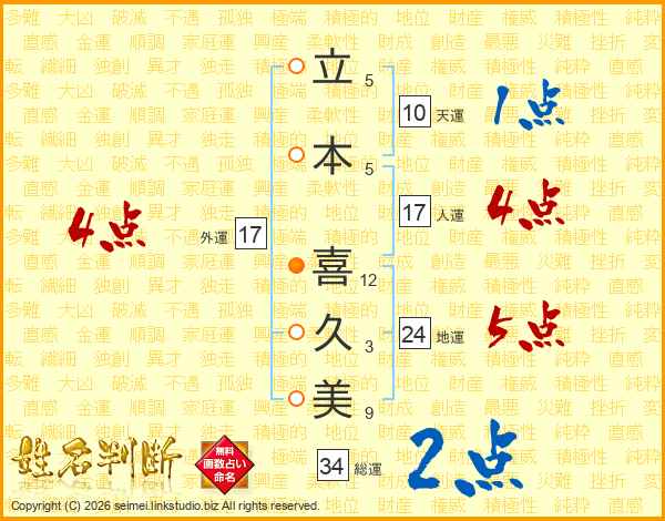 立(5画)本(5画) 喜(12画)久(3画)美(9画)