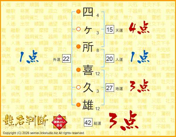 四(4画)ヶ(3画)所(8画) 喜(12画)久(3画)雄(12画)