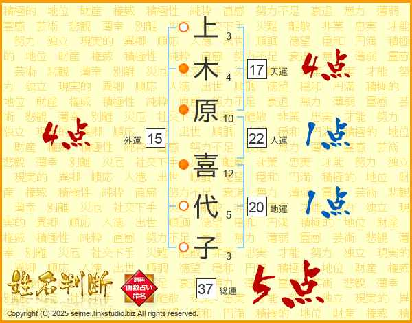 上(3画)木(4画)原(10画) 喜(12画)代(5画)子(3画)