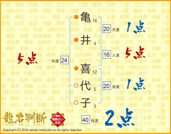 亀(16画)井(4画) 喜(12画)代(5画)子(3画)