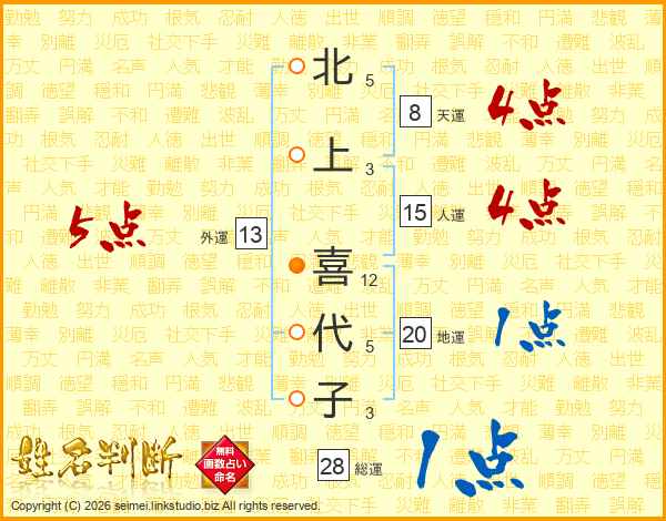 北(5画)上(3画) 喜(12画)代(5画)子(3画)