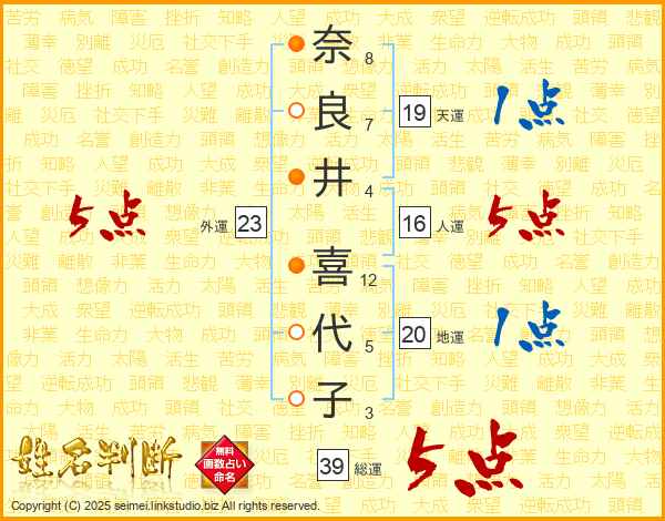 奈(8画)良(7画)井(4画) 喜(12画)代(5画)子(3画)